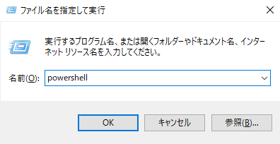 インストールが終了したら「Winキー + Rキー」を押下し「ファイル名を指定して実行」ダイアログを表示させて「powershell」と入力してEnterキーを押下します。