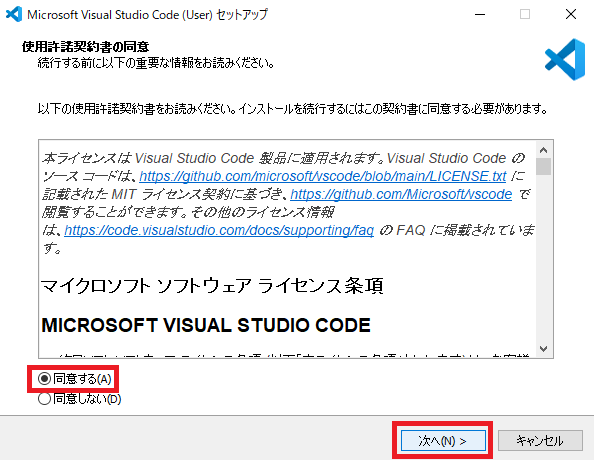 インストーラを起動させると以下のような画面になるので「同意する」を選択して「次へ」をクリックします。