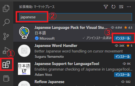 Visual Studio Codeを起動させて左側にあるメニューの四角いアイコンの「拡張機能」をクリックし、検索欄に「japanese」と入力して出てきた一番上にある「Japanese Language Pack for Visual Studio Code」の「インストール」ボタンをクリックしてインストールします。