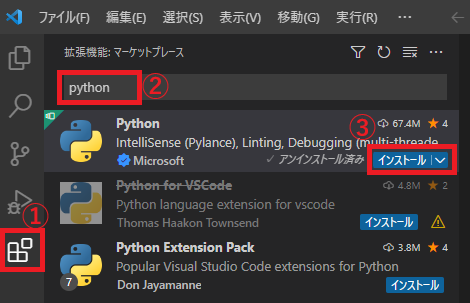 先ほどと同じように、左側にあるメニューの四角いアイコンの「拡張機能」をクリックし、検索欄に「python」と入力して出てきた一番上にある「Python」の「インストール」ボタンをクリックしてインストールします。