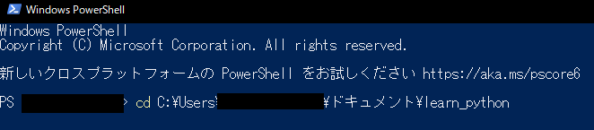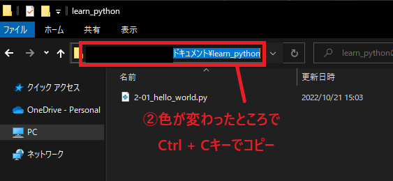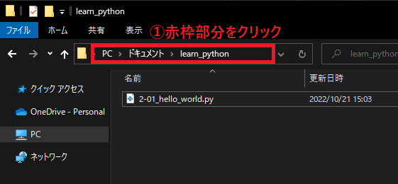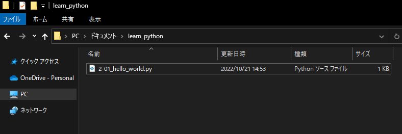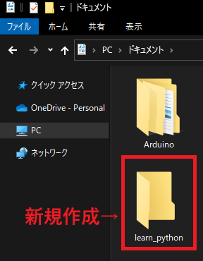 今回は例として「learn_python」というフォルダをマイドキュメント配下に作成したとして進めます。このフォルダ内にPythonのファイルを作成していきます。