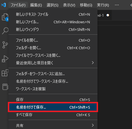 記述できたらメニューの「ファイル」→「名前を付けて保存」をクリックします。