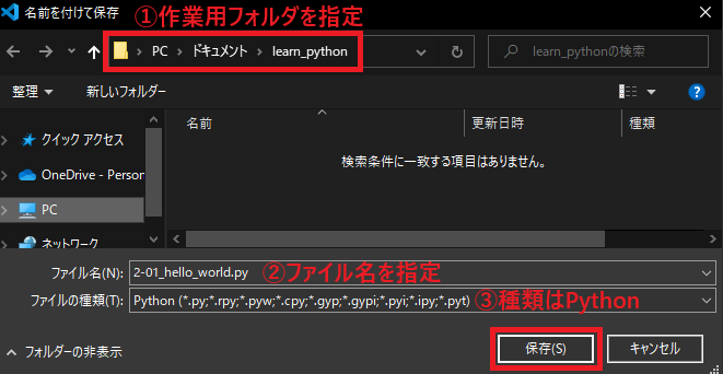 保存ダイアログが出てくるので、保存先を作業用フォルダにし、ファイル名を「2-01_hello_world」にします。そしてファイルの種類を「Python」にしてから「保存」ボタンをクリックします。