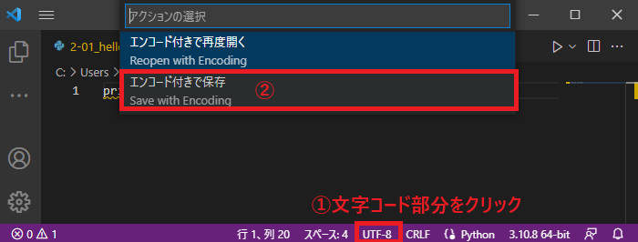 もしUTF-8の文字コードになっていなかった場合は、以下のように文字コード部分をクリックして出てきた「エンコード付きで保存」をクリックします。