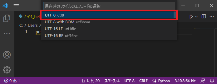 PythonのソースコードはUTF-8で書かれていることが多いので、文字コードは合わせるようにしてください。例えばこれが「Shift-JIS(SJIS)」などの場合、日本語で記述した部分が文字化けして正常に動かなくなります。