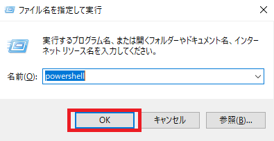 キーボードの「Winキー + Rキー」を押下して「ファイル名を指定して実行」を表示させ、名前欄のところに「powershell」と入力してEnterキーを押下します。ちなみにWinキーとはWindowsのマークになっているキーです。