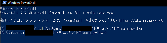 コピーできたらPowerShellの画面に戻って「cd」と記述した後に半角スペースを入力し、その後マウスの右クリックを押下すると先ほどコピーしたパスがペーストされます。